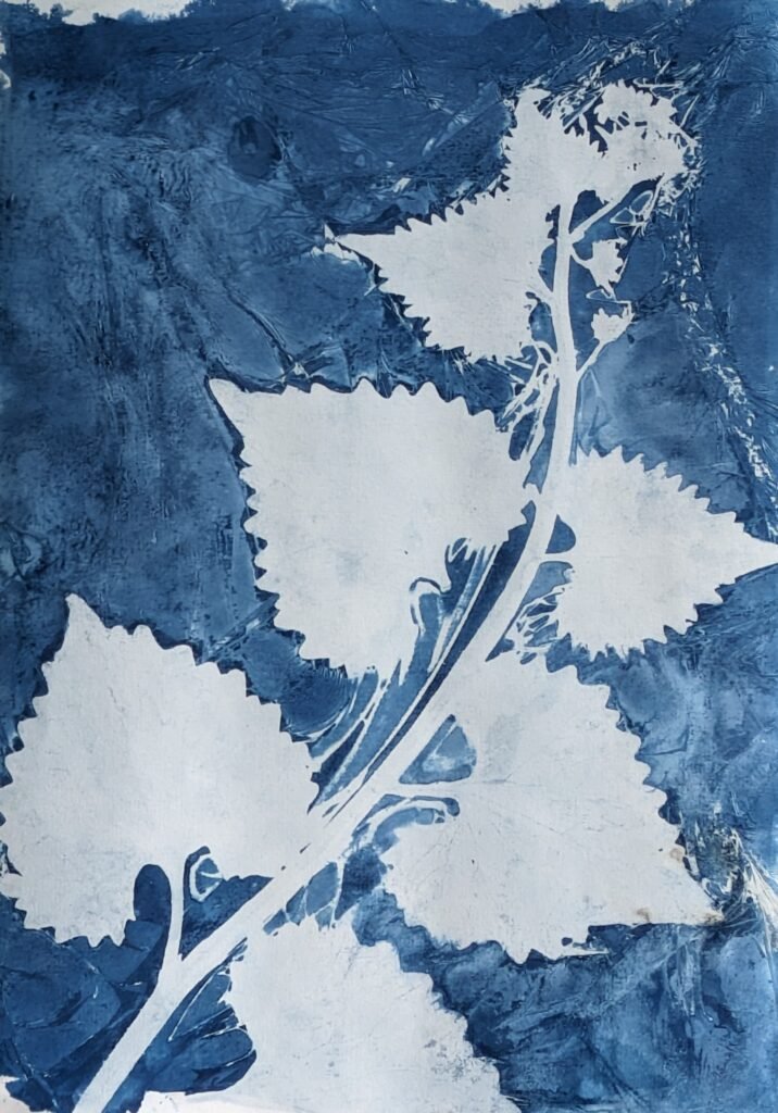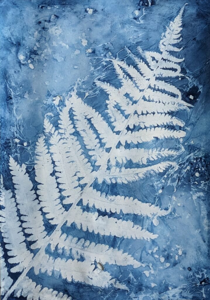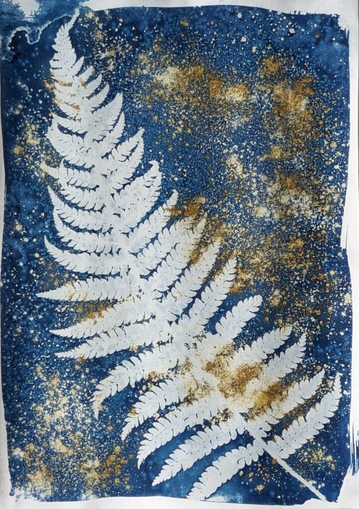 ‘Fern Supernova’, 21 cm x 30 cm, Wet cyanotype, turmeric, and salt on watercolour paper, 2024.‘Fern in Water’, 21 cm x 30 cm, Wet cyanotype, lemon juice, and rock salt on watercolour paper, 2024.‘Flower’, 21 cm x 30 cm, Wet cyanotype and lemon juice on watercolour paper, 2024.