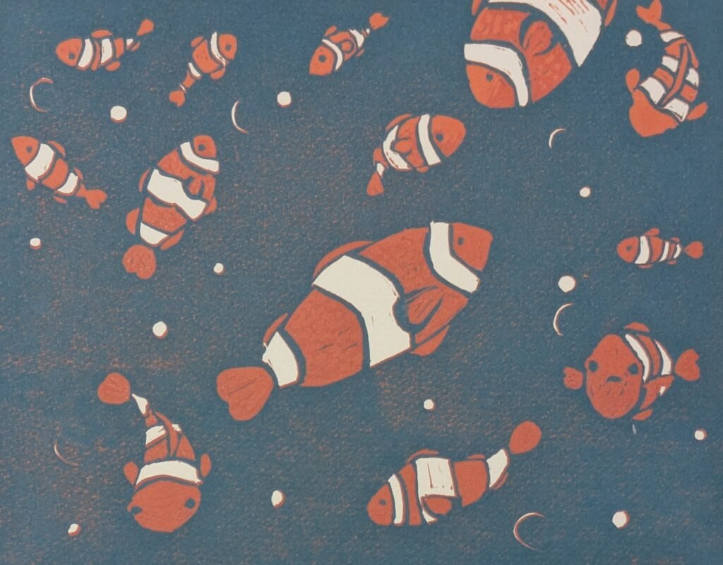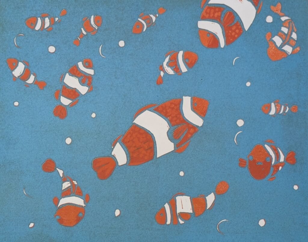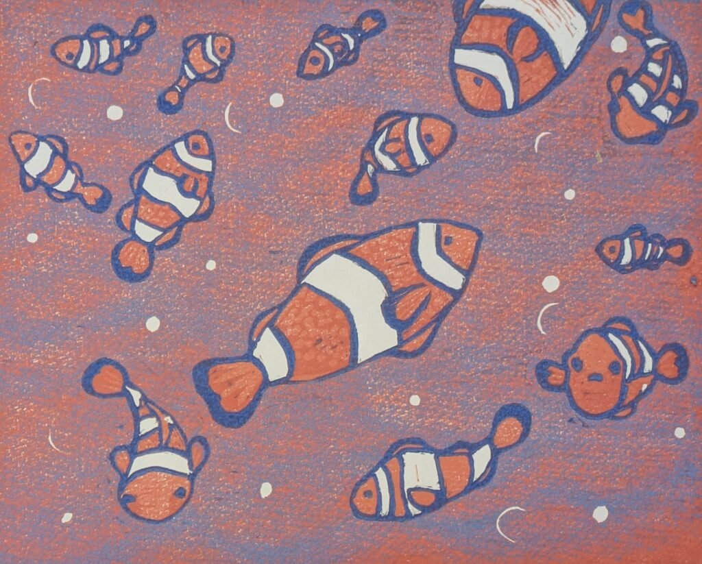‘School of Clownfish’, 20cm x 25cm, Reduction Linocut on Rives Cream Paper, 2024.