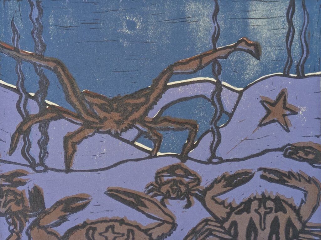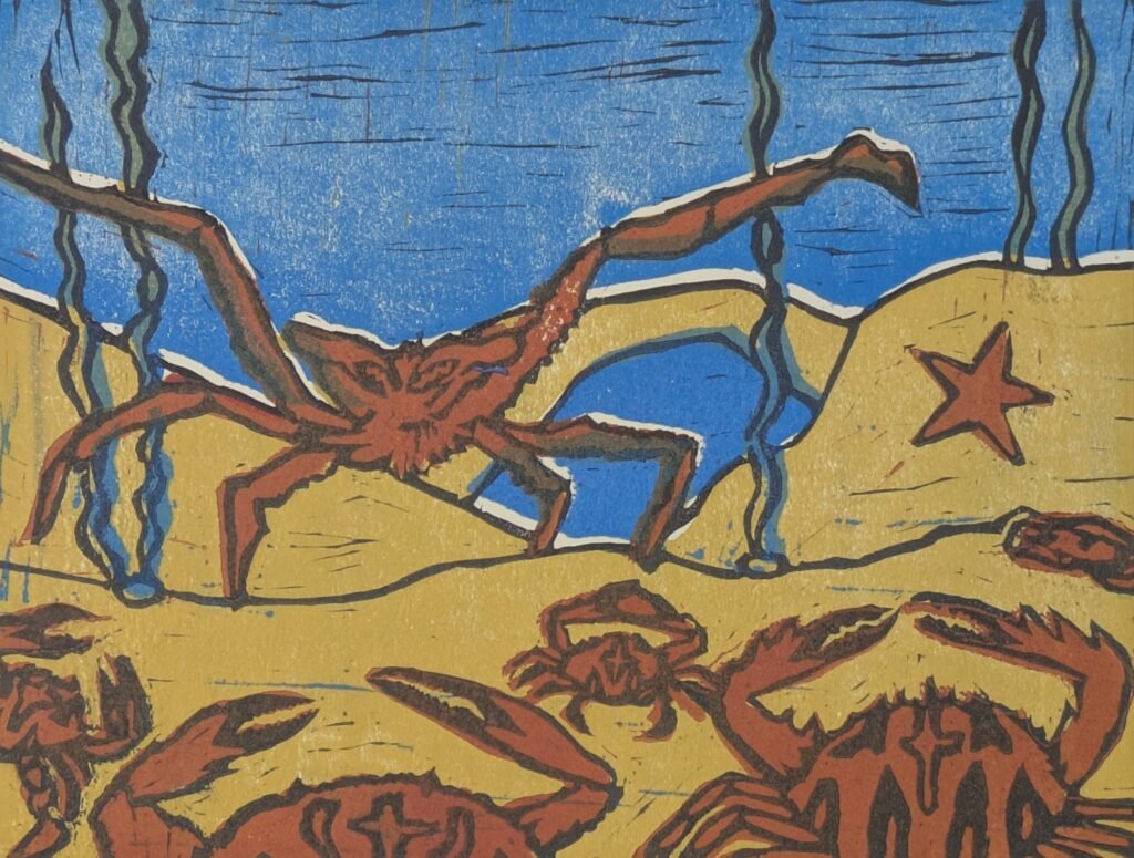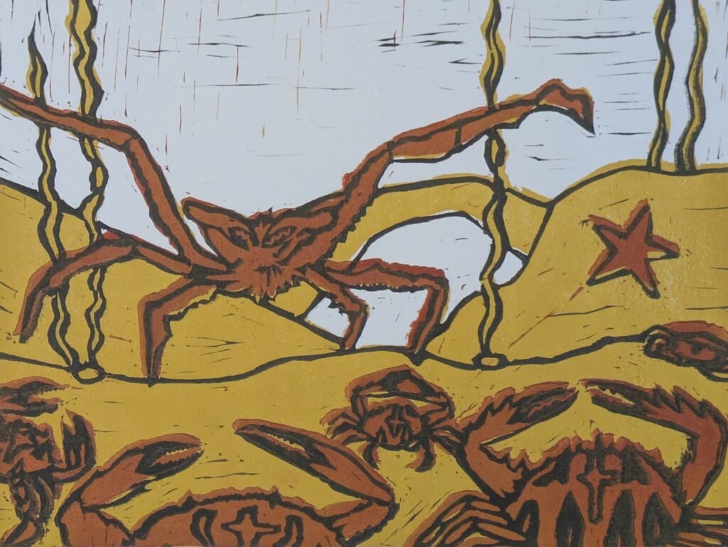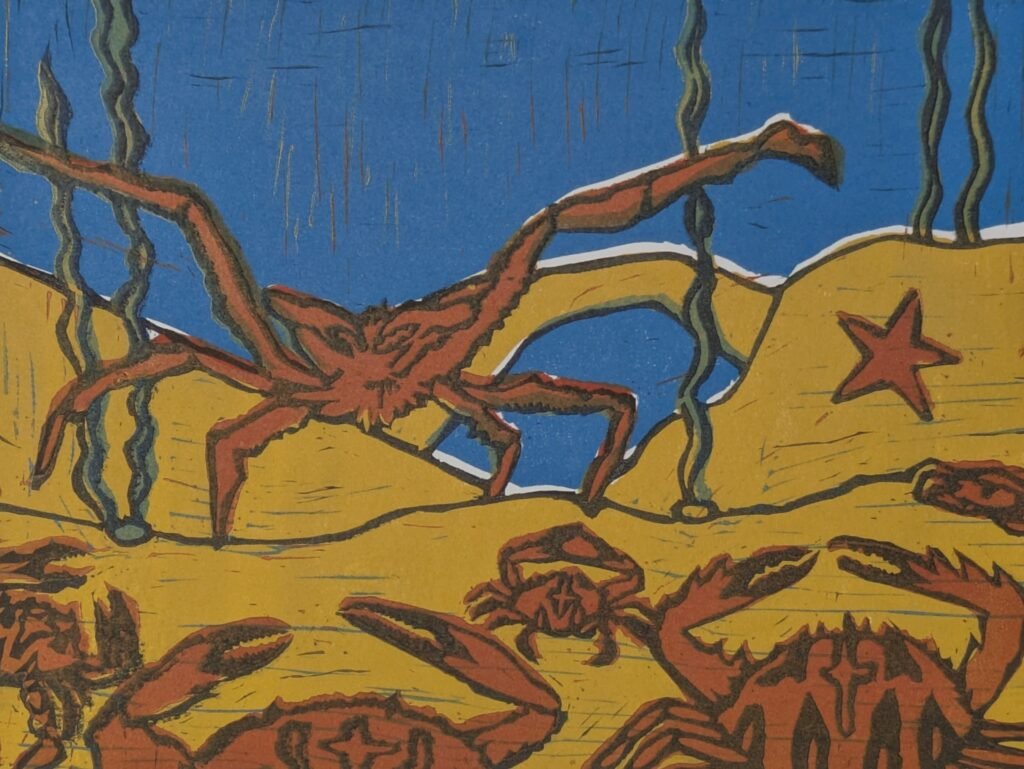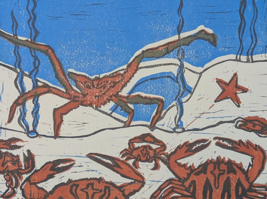 ‘The Crustacean Crusade’, 15cm x 20cm, Multiple Block Japanese Vinyl Print on Rives Cream paper, 2024.‘The Crustacean Crusade’, 15cm x 20cm, Multiple Block Japanese Vinyl Print on Somerset Satin Paper, 2024.‘The Crustacean Crusade’, 15cm x 20cm, Multiple Block Japanese Vinyl Print on Somerset Satin Paper, 2024.‘The Crustacean Crusade’, 15cm x 20cm, Multiple Block Japanese Vinyl Print on Rives Grey Paper, 2024.‘The Crustacean Crusade’, 15cm x 20cm, Multiple Block Japanese Vinyl Print on Rives Cream Paper, 2024.‘The Crustacean Crusade’, 15cm x 20cm, Multiple Block Japanese Vinyl Print on Rives Cream Paper, 2024.