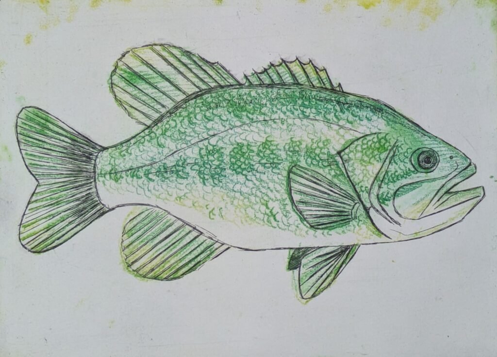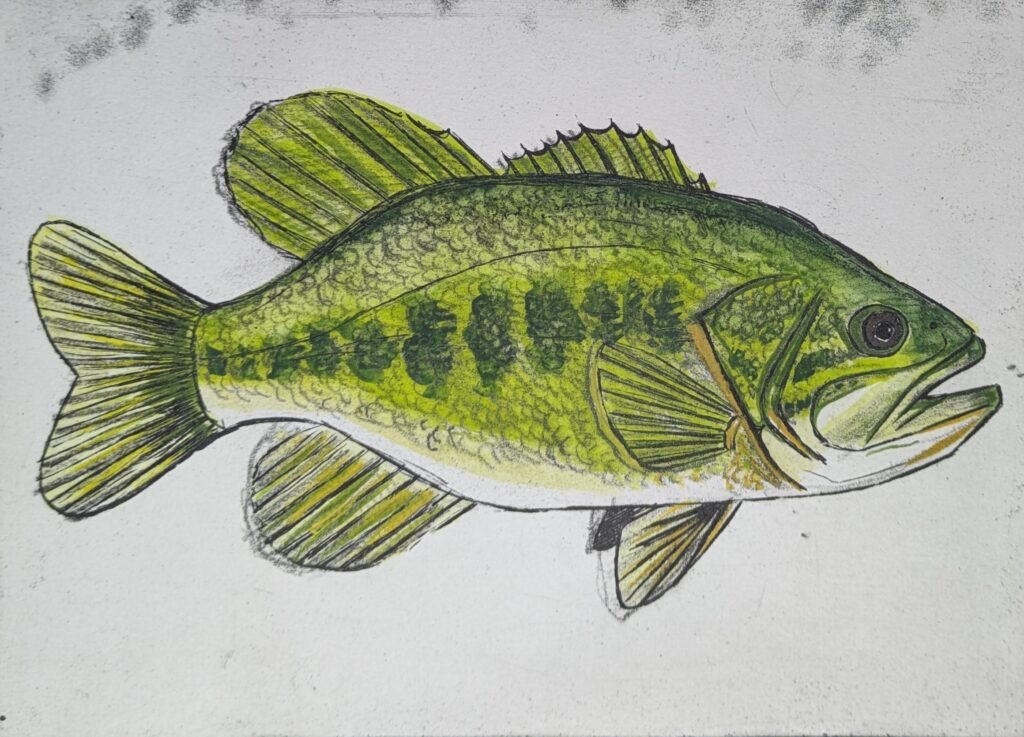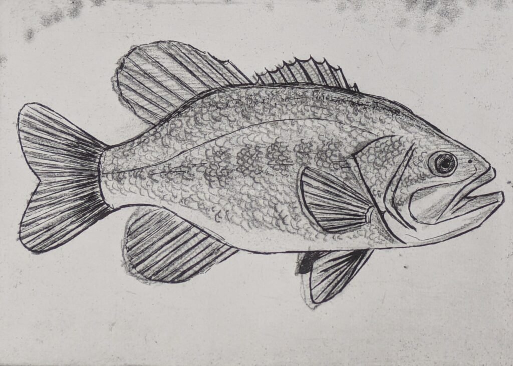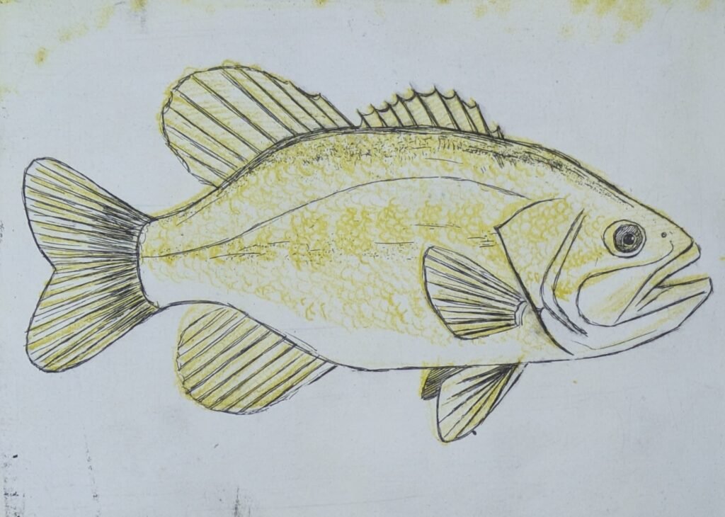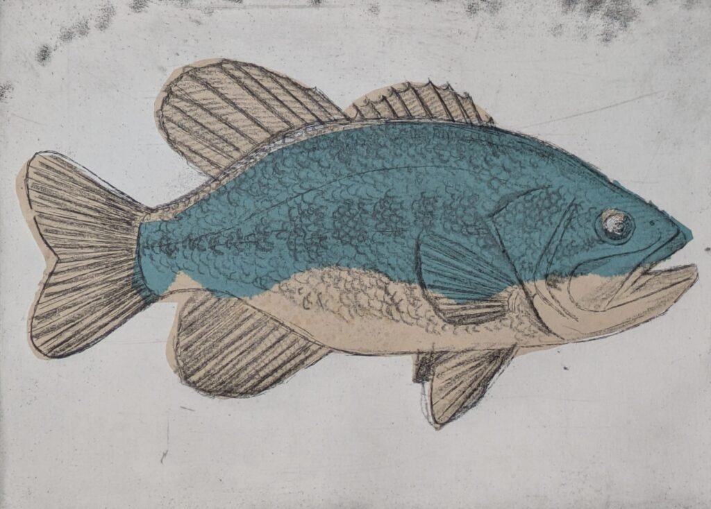 ‘Bass’, 15cm x 21cm, Gouache on Multiple Plate Etching – Hard Ground and Soft Ground Copper Plate Etchings on Hahnemühle Paper, 2024.
