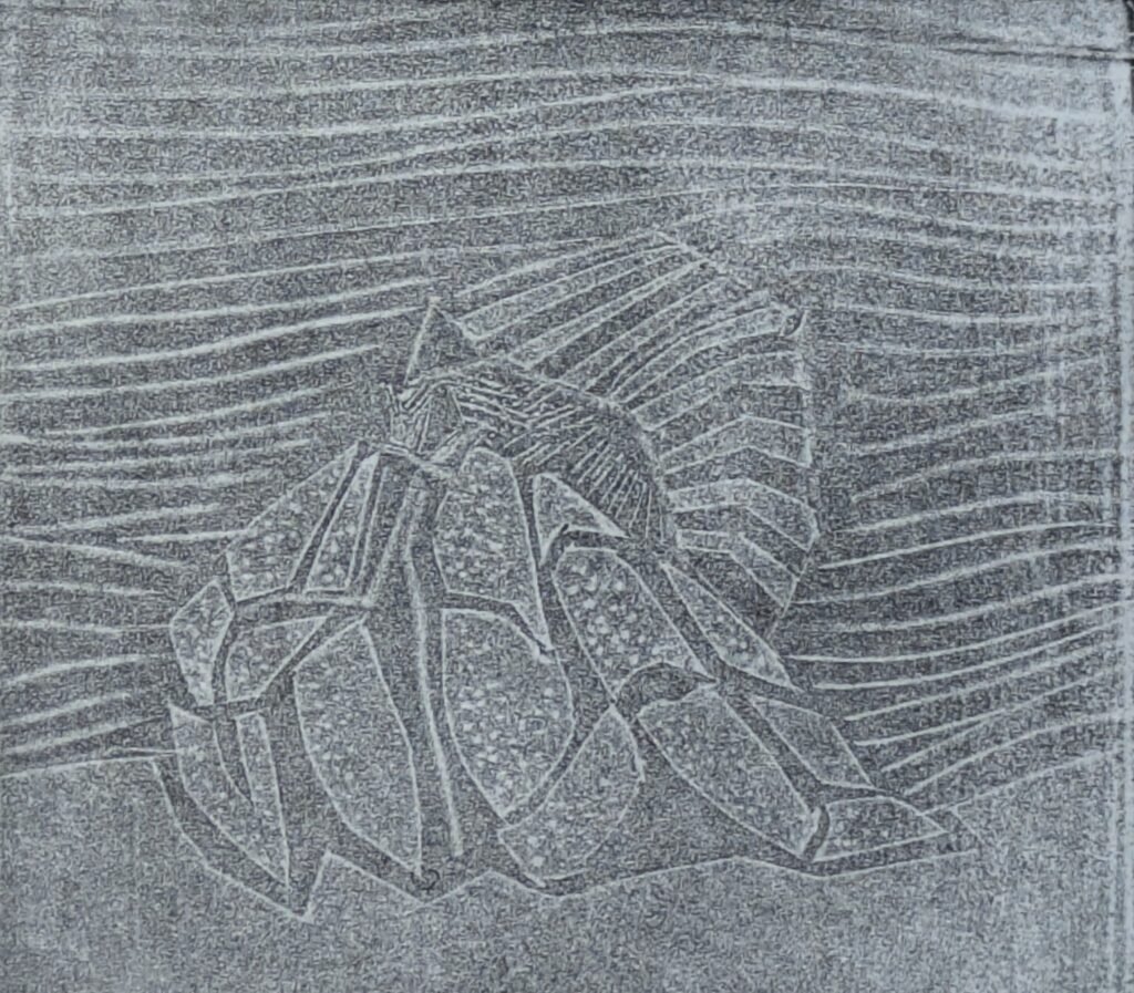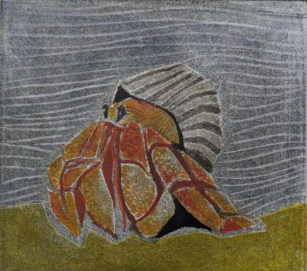 ‘Hermit Crab’, 9.5cm x 11cm, Collagraph Transfer on Hahnemühle Paper, 2024.‘Hermit Crab’, 9.5cm x 11cm, Collagraph Transfer on Hahnemühle Paper, 2024.‘Hermit Crab’, 9.5cm x 11cm, Chine Collée and Collagraph Transfer on Hahnemühle Paper, 2024.