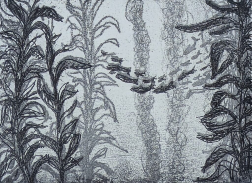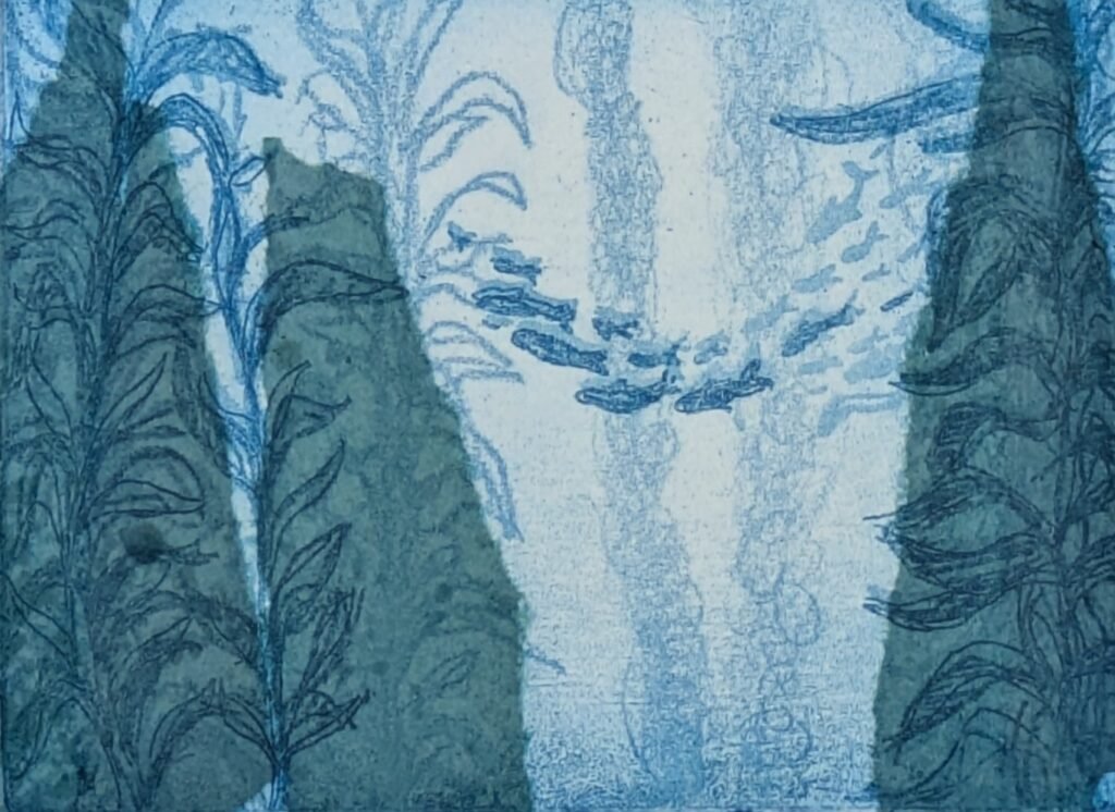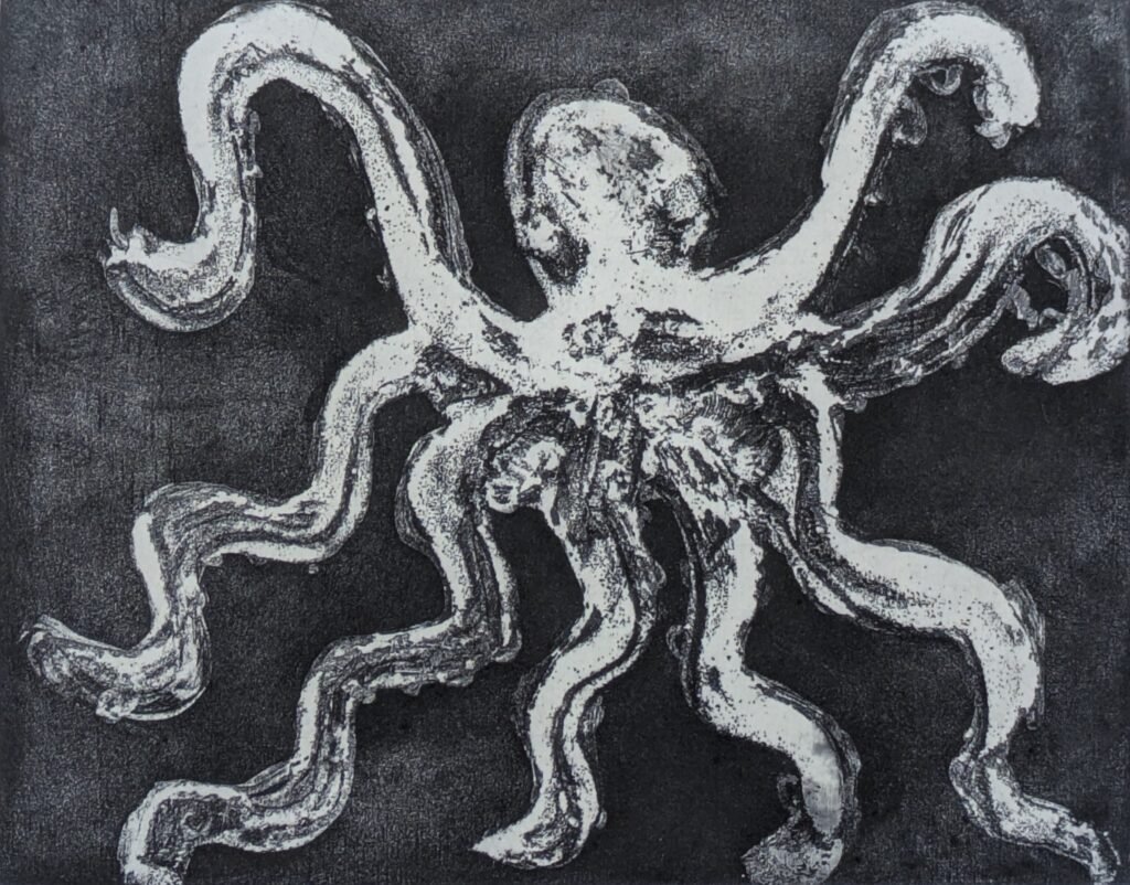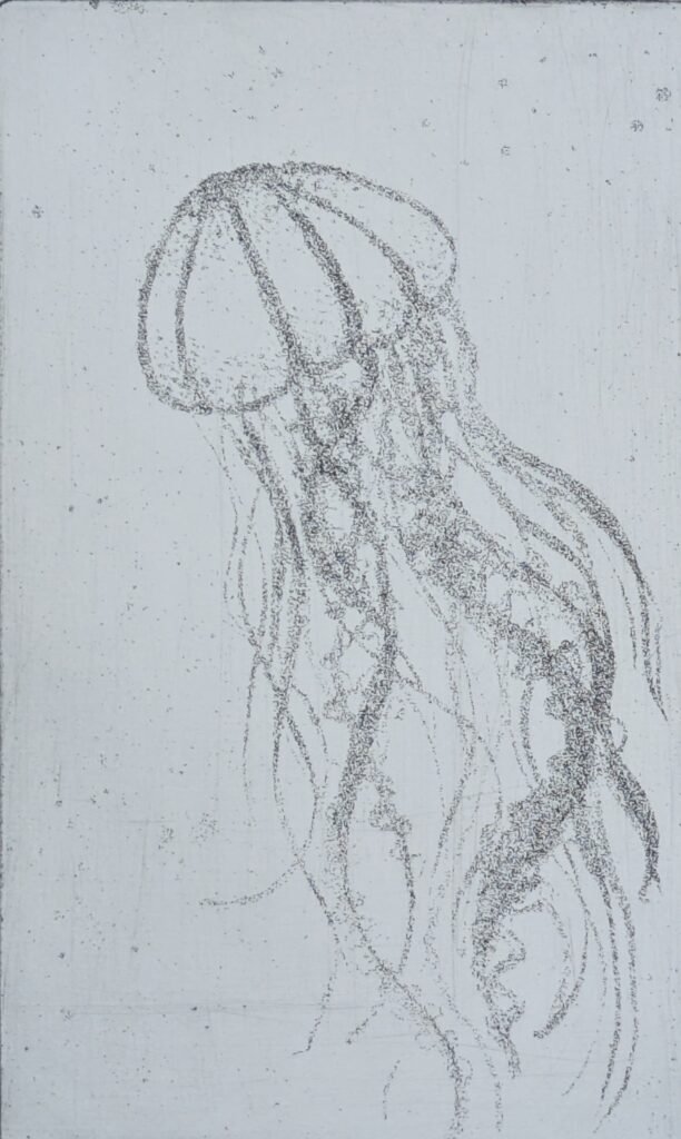 ‘Jellyfish’, 18cm x 11cm, Gouache and Coffee Lift Etching on Hahnemühle Paper, 2024. ‘Jellyfish’, 18cm x 11cm, Coffee Lift Etching on Hahnemühle Paper, 2024. ‘Jellyfish’, 18cm x 11cm, Coffee Lift Etching on Hahnemühle Paper, 2024. ‘Fish in a Kelp Forest’, 7cm x 9.5cm, Soft Ground Etching on Hahnemühle Paper, 2024. ‘Fish in a Kelp Forest’, 7cm x 9.5cm, Soft Ground Etching on Hahnemühle Paper, 2024. ‘Fish in a Kelp Forest’, 7cm x 9.5cm, Chine Collée and Soft Ground Etching on Hahnemühle Paper, 2024. ‘Octopus’, 13cm x 16cm, White Ground Aluminium Etching on Hahnemühle Paper, 2024.‘Octopus’, 13cm x 16cm, White Ground Aluminium Etching on Hahnemühle Paper, 2024.‘Octopus’, 13cm x 16cm, Gouache and White Ground Aluminium Etching on Hahnemühle Paper, 2024.