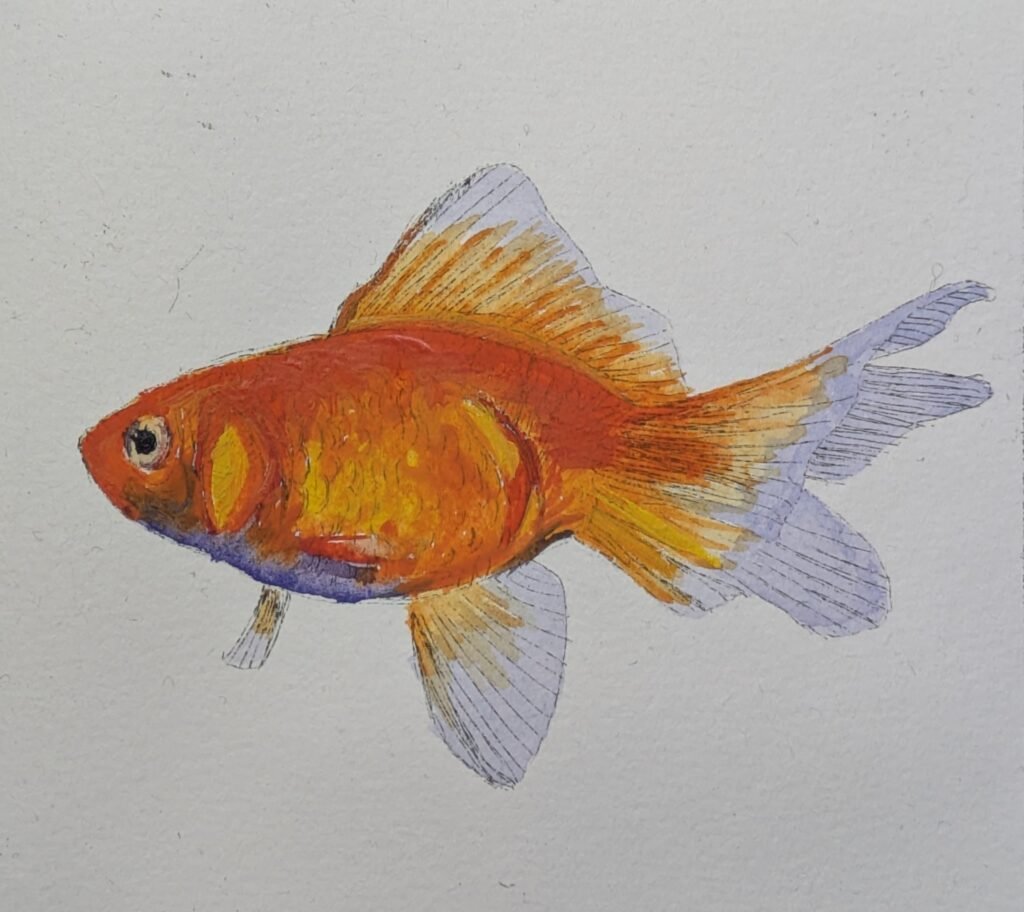 ‘Goldfish’, 9cm x 10cm, Gouache and Hard Ground Etching on Hahnemühle Paper, 2024.